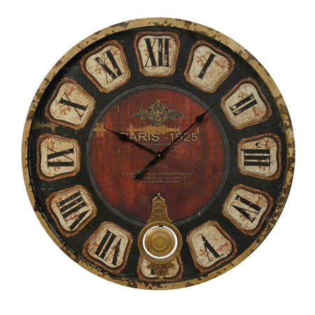 | 24" Large French Pendulum Wooden Wall Clock. Paris - 1925 French Gallery Wall Clock.This big beautiful gallery wall clock sets the stage. Aged in Dark Tuscan Colorings of burnt red and black. Distressed through out for the feel of authenticity. Working Pendulum is of metal... the markings are done in a deeper gold and the roman numerals are done in soft black outlined in a softer burnt tan. Soft French decoupage over 1/4" of wood.. color themed in Black and burnt Red. The edging in more worn giving it the look of a timeworn French antique.Wording on face reads "PARIS ~ 1925"The clock is 24" round and comes off the wall 2".Quartz Movement. Requires 2 AA battery not included.Will ship federal express ground unless requested otherwise.Batteries not included. ...Read