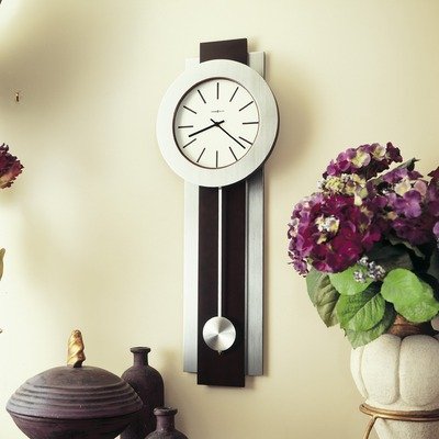 | The Bergen Wall Clock by Howard Miller is a contemporary design with a Merlot Cherry finish and contrasting brushed nickel-finished pendulum, bezel, and side bars. ...Read