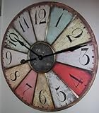 | Large vintage looking wall clock with a distressed finish Beautiful multi-colored segments separated with strips of metal.Will work with many decors. A real showpiece!"Paris" and two faux winding holes shown at center of faceLarge black hands with a Fleur de Lis on one handMeasures 29"Operates on one "AA" battery ...Read