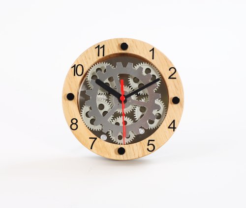 | This table or wall clock features visible moving gears. The plastic body is faced with a brushed aluminum dial and has a mix of brushed aluminum and silver plastic gears along with a red second hand. A wooden ring dial is mounted on the front with the hours on it. The clock is 6-1/4-inch in diameter and 2-inch deep. Precision timing is kept with quartz crystal. The clock is powered by 2 c batteries (not included) and includes a 1 year limited warranty. ...Read