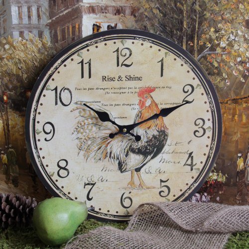 | A wooden wall clock features a vintage rooster design. It is 13.25 inches in diameter. Uses a AA battery/not included. ...Read